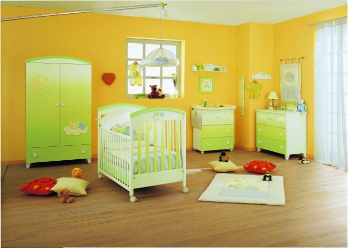 Żółte dodatki w pokoju dziecięcym w delikatnym zielonym kolorze.